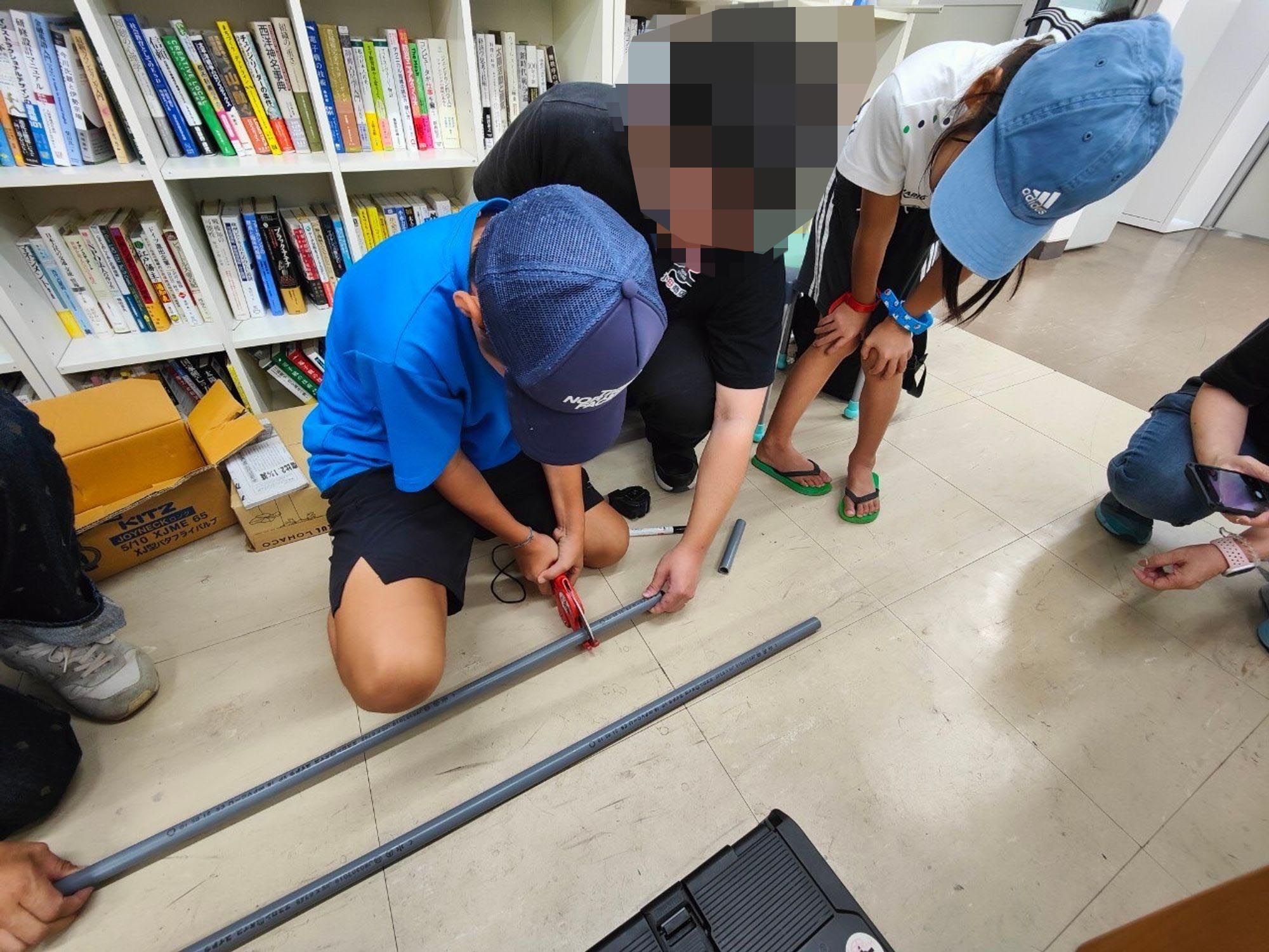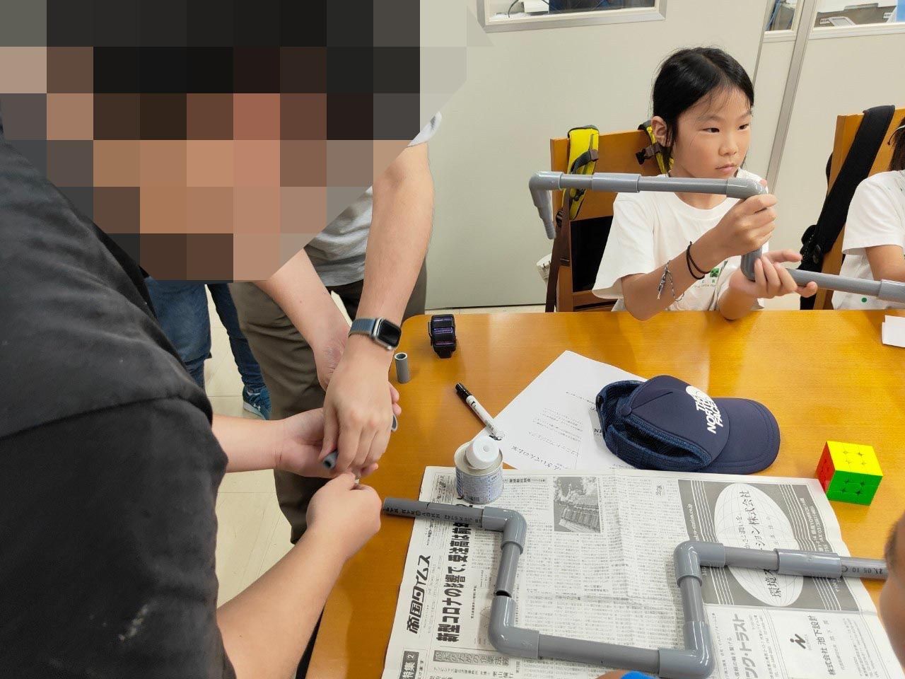 切断したパイプに継ぎ手を差し込んで仮組みをしていきます。最初に噴水として組む見本をつくって、これを作ってみようと作っていたのですが、自由につくりたいという希望もあったので、自由につくっていいよとだんだん自由工作になっていきます。